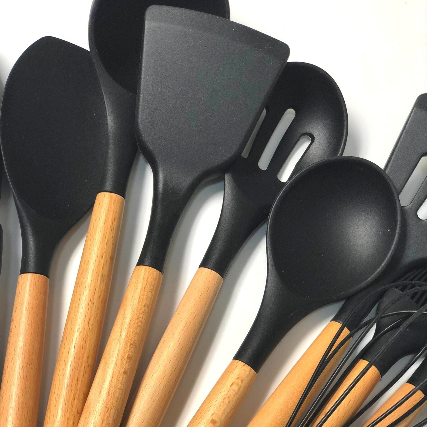 Level up your Kitchen with our 11 piece black silicone utensil set. This unique cooking set brings a modern vibe to your kitchen made with the highest quality bamboo handles and silicone heads to ensure you can cook without leaving any scratches on your pans. Including all of your Kitchen essentials this set makes the perfect housewarming gift.